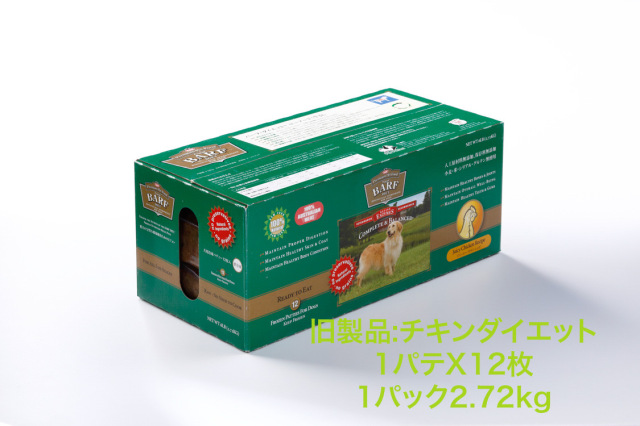 | 原材料 | 鶏(肉、粉砕骨と軟骨、心臓、肝臓)人参、グリーンバナナ、インゲン、レタス、小麦若葉、オレンジ、ストロベリー、サイリユム、ケルプ、