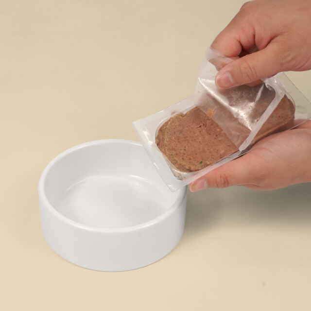 生のペットフードは一定の時間、常温放置されると品質が損なわれます。ペットが食べ残した物は、廃棄してください。また、一度解凍したら絶対に再冷凍しないでください。